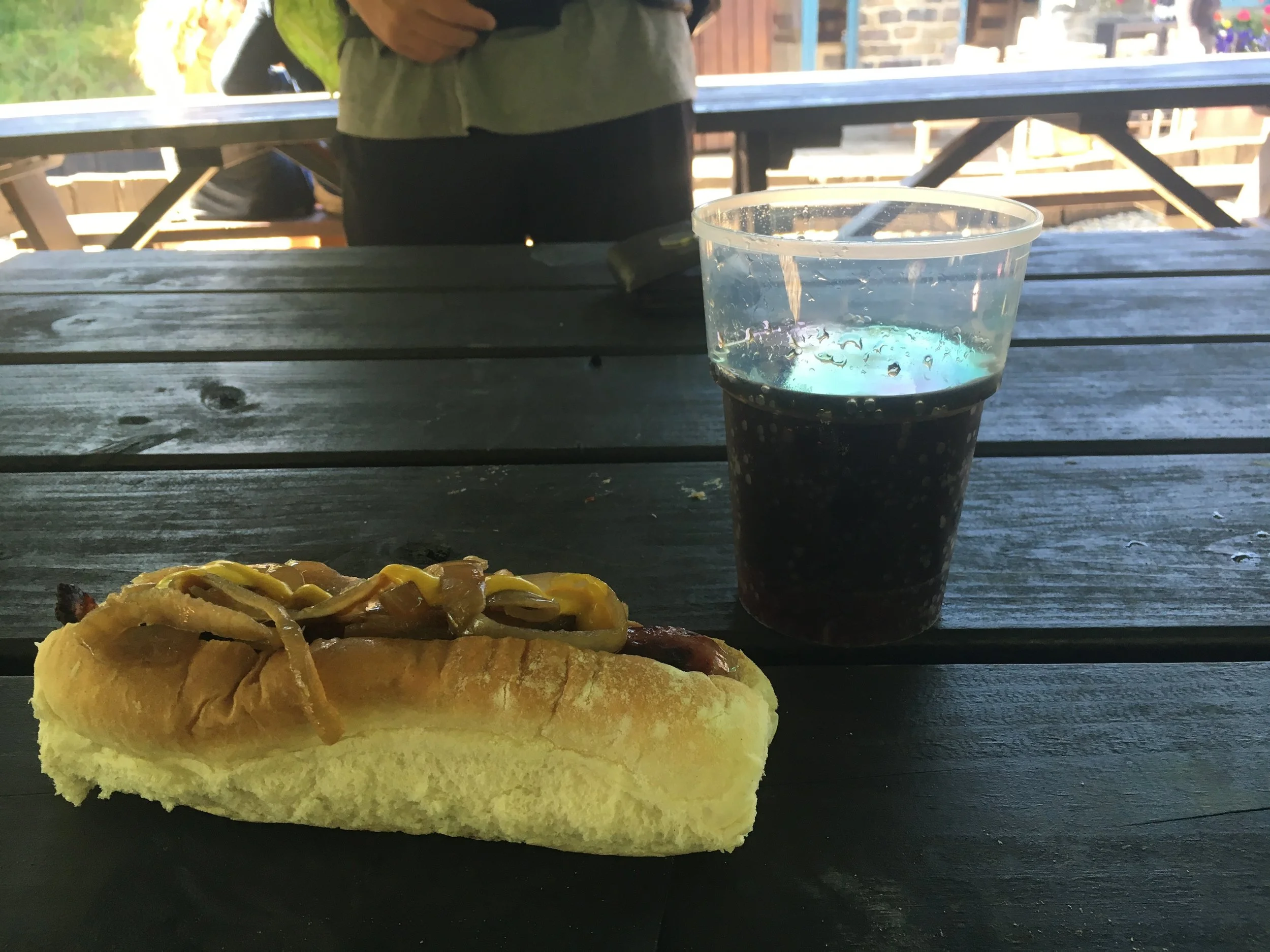 Inbetween two of the peaks we started hearing a bunch of cheering and horns in the direction we were heading. Eventually we came across the outside festival area of a dirt bike competition. Craig popped into the nearby restroom. I popped into the event to grab a brat and a drink. It was delicious.